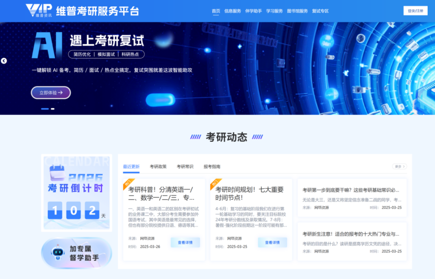 《维普考研服务平台》整合了学习服务、信息服务、AI伴学助手、复试专区、图书馆专属支撑服务五大功能版块,满足考研学生从初试到复试的全链路需求,提供“精准、深度、陪伴式”的一站式备考解决方案。